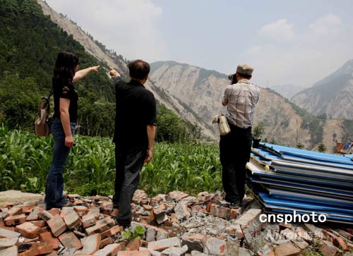 失事直升機殘骸10日晨在四川汶川映秀鎮(zhèn)3511高地(當?shù)卮迕穹Q“火燒杠”)被發(fā)現(xiàn),圖為記者遙望四川省軍區(qū)司令員率部趕赴的山頭。中新社發(fā) 賈國榮 攝