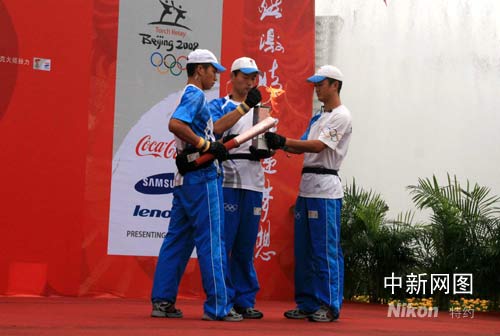 6月12日,北京奧運(yùn)火炬在貴陽傳遞。圖為圣火護(hù)衛(wèi)隊(duì)員從火種燈內(nèi)取火,點(diǎn)燃第一支火炬。記者周兆軍攝