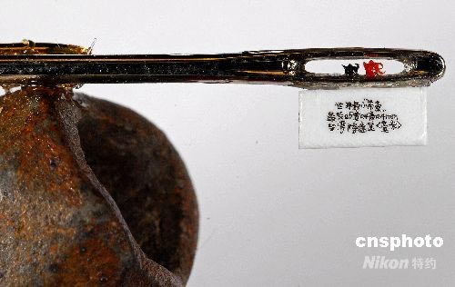 6月13日,臺灣著名微雕家陳逢顯攜其“世界最小茶壺”系列來北京進行文化訪問。圖為陳逢顯用黑翡翠和紅翡翠石粉末雕刻的世界最小茶壺,置于針孔中。中新社發(fā) 陳立宇 攝