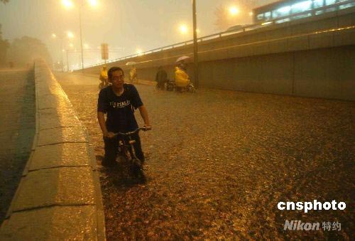 6月13日下午5時許,強雷陣雨突襲京城,北京市氣象臺發(fā)布了雷電黃色預警信號。 圖為在北京一橋下積水路段,民眾“河”中推車。中新社發(fā) 富田 攝