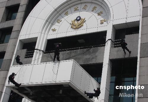 臺(tái)北市政府警察局十三日舉辦慶祝警察節(jié)活動(dòng),安排安排平日難得一見(jiàn)的特勤中隊(duì)表演戰(zhàn)技操演,隊(duì)員們?nèi)蔽溲b直接從警察局十三樓樓頂一路攀降而下,這也是臺(tái)北市警局大樓首次出現(xiàn)的高樓特警攀降表演。中新社發(fā) 耿軍 攝