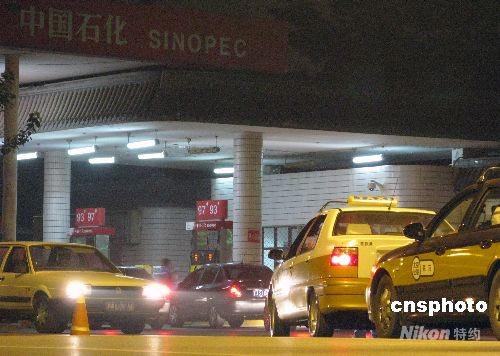 國家發(fā)展改革委決定自2008年6月20日起將汽油、柴油價格每噸提高1000元,航空煤油價格每噸提高1500元。圖為6月19日深夜,北京部分司機獲悉成品油調價消息后,趕在20日凌晨零點前在加油站排起長龍加油。 中新社發(fā) 余瑞冬 攝