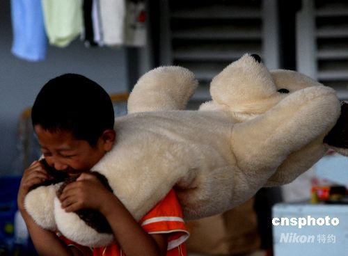 避難小男孩背著贈(zèng)送的毛絨玩具玩耍。中新社發(fā) 賈國榮 攝