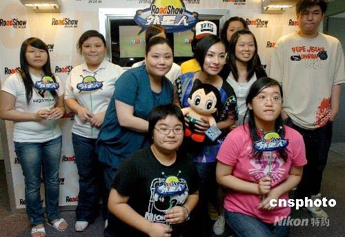 圖為“粉絲”贈(zèng)送劉璇動(dòng)畫明星“阿童木”毛公仔,并與偶像合影。中新社發(fā) 鄧慶樂(lè) 攝