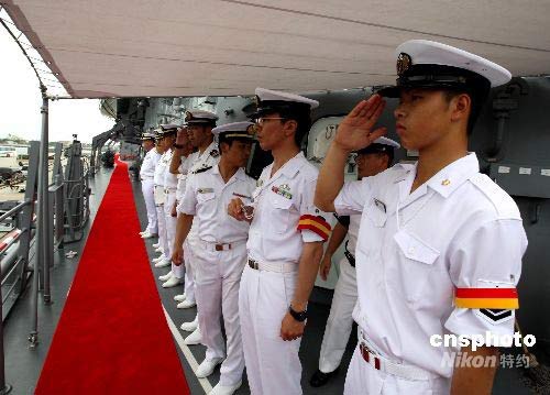 6月24日15時(shí)30分,日本海上自衛(wèi)隊(duì)“漣”號(hào)驅(qū)逐艦抵達(dá)中國湛江港碼頭。這是日本自衛(wèi)隊(duì)艦艇首次訪華,隨艦搭載向四川災(zāi)區(qū)提供的救援物資。日本海上自衛(wèi)隊(duì)第四護(hù)衛(wèi)隊(duì)群司令德丸伸一少將任指揮官,隨訪官兵240人。中國人民解放軍海軍官兵在湛江碼頭舉行儀式歡迎日本“漣”號(hào)艦艇訪華。圖為日艦艇官兵向歡迎儀式上的中國人民解放軍海軍官兵行禮。中新社發(fā) 宋吉河 攝