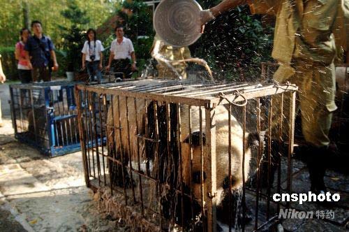 圖為福州大熊貓世界員工為4只來(lái)福州的臥龍大熊貓進(jìn)行入舍前消毒洗塵。中新社發(fā) 鄭祚聲 攝