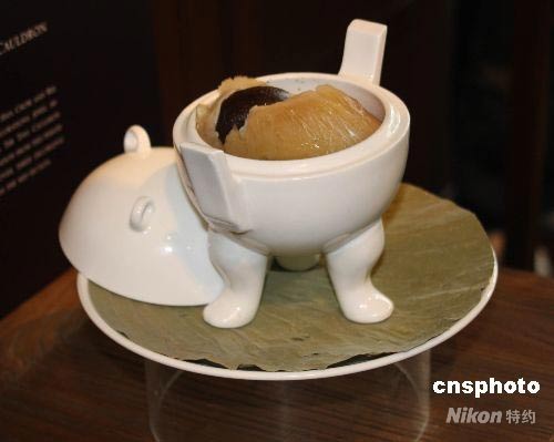 圖為戰(zhàn)國時(shí)代青銅器的代表作“弦紋鼎”,被仿制成白瓷容器,盛裝閩菜之首“佛跳墻”。 中新社發(fā) 耿軍 攝