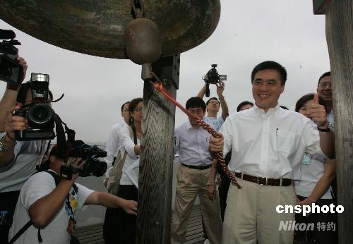 6月26日,臺(tái)北市市長(zhǎng)郝龍斌在滬考察正在建造中的上海世博會(huì)參展場(chǎng)址、了解世博會(huì)籌備情形,并撞鐘祝福上海世博會(huì)成功。中新社發(fā) 潘索菲 攝