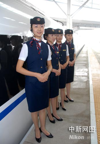 乘務員都是經(jīng)過重重選拔,外形條件業(yè)務素質(zhì)都比較高,她們甜美的微笑吸引了很多記者的鏡頭。王紅綱 攝