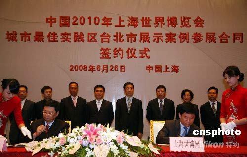 6月26日晚,臺(tái)北市簽約參展二0一0年上海世博會(huì),臺(tái)北案例參展總協(xié)調(diào)人脫宗華代表臺(tái)北市與上海世博局洪浩局長(zhǎng),在上海西郊賓館簽署參展合同,臺(tái)北市市長(zhǎng)郝龍斌、上海市市長(zhǎng)韓正、上海市副市長(zhǎng)楊雄、鴻?萍技瘓F(tuán)暨富士康科技集團(tuán)董事長(zhǎng)郭臺(tái)銘等作為簽約見(jiàn)證人,出席簽約儀式。中新社發(fā) 潘索菲 攝