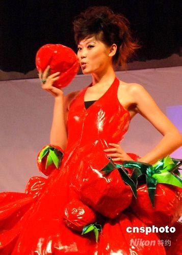 6月26日晚,閩江學院服裝與藝術(shù)工程系08屆畢業(yè)設計作品展演在福州舉行。圖為一名模特展示《西紅柿》服裝系列。中新社發(fā) 劉可耕 攝