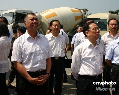 曾蔭權(quán)何厚鏵站在地震廢墟清理現(xiàn)場表情凝重