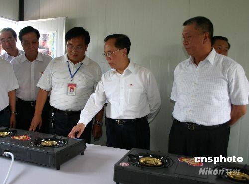 香港特首曾蔭權(quán)、澳門特首何厚鏵一行在四川省副省長魏宏陪同下,抵達地震重災(zāi)區(qū)彭州市小漁洞鎮(zhèn)大楠社區(qū)安置點,慰問當?shù)厥転?zāi)群眾,參觀安置房、公共廚房和安置點內(nèi)的娛樂設(shè)施,并體驗了公共廁所。中新社發(fā) 霍潺 攝