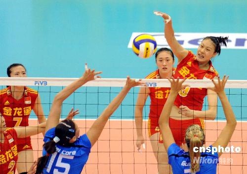 六月二十九日,中國(guó)女排在香港舉行的“世界女排大獎(jiǎng)賽香港站”上, 以三比二險(xiǎn)勝意大利,登上冠軍寶座。圖為中國(guó)女排選手趙蕊蕊大力扣殺。中新社發(fā) 洪少葵 攝