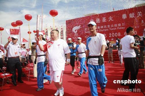 擔(dān)任吳忠第一棒奧運(yùn)火炬手是企業(yè)家霍慶華,在5.12汶川大地震中,霍慶華向?yàn)?zāi)區(qū)捐款500萬(wàn)人民幣,是寧夏個(gè)人捐助最多者。中新社發(fā) 蘆河 攝
