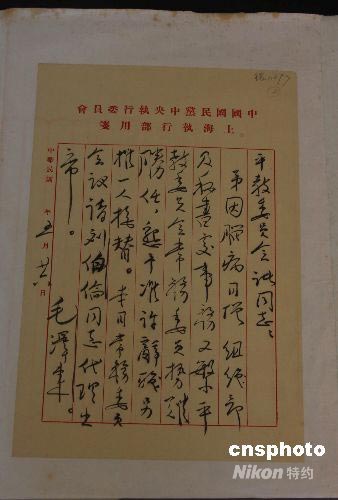這是中國國民黨黨史館館藏的一九二四年毛澤東致平教委員會(huì)諸同志的一封親筆信。中新社發(fā) 耿軍 攝