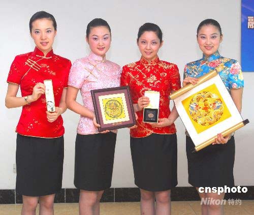 南京首航兩岸周末包機(jī)“神秘小禮物”揭曉,包括南京特有石頭雨花石所做成的擺設(shè)品、手鏈和鑰匙扣以及“工藝之寶”云錦!吧韮r(jià)不菲”的南京云錦卷軸掛畫可能會(huì)饋贈(zèng)給頭等艙旅客。中新社發(fā) 王浩 攝