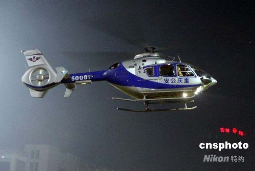7月2日晚,重慶市舉行“迎奧運(yùn)、保平安”反恐綜合演練。此次演練是該市為做好2008年北京奧運(yùn)會安全保衛(wèi)工作,舉行的一次突出反恐實(shí)戰(zhàn)技能、對抗性強(qiáng)的綜合演練,演練由“處理暴力騷亂事件演練”、“加油站火災(zāi)和高樓救援”、“公共汽車反劫持演練”等3部分共9個(gè)項(xiàng)目組成。圖為重慶首架警用直升機(jī)在演練上首次公開亮相。中新社發(fā) 郭晉嘉 攝