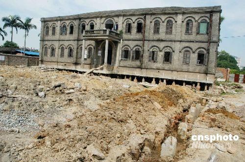 2008年7月3日,福州老洋房泛船浦教堂神父樓在上百個(gè)千斤頂?shù)闹蜗码x地1米,準(zhǔn)備整體平移。這棟老洋房由于位于建設(shè)規(guī)劃范圍內(nèi),經(jīng)過一年多準(zhǔn)備,福州市有關(guān)部門決定對(duì)泛船浦教堂神父樓實(shí)施整體平移,以利于文物保護(hù)和減少經(jīng)濟(jì)損失。這幢樓將先往東平移75.6米,再整體旋轉(zhuǎn)90度向南平移30.7米,由東西朝向變?yōu)槟媳背。該教堂建?932年秋,1933年9月落成,耗資17萬銀元,建筑風(fēng)格屬半哥特式、半法國(guó)式。中新社發(fā) 張 斌 攝