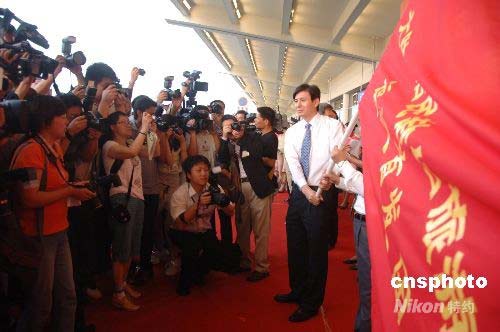 7月4日上午,赴臺旅游福建首發(fā)團(tuán)暨周未包機(jī)首航儀式在廈門高崎國際機(jī)場候機(jī)摟舉行。福建省洪捷序副省長(右一)到場祝賀,并向“赴臺旅游福建首發(fā)團(tuán)”授旗。中新社發(fā) 鄭祚聲 攝