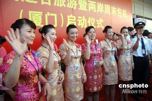圖:廈航空乘人員著新裝服務(wù)兩岸周末包機(jī)
