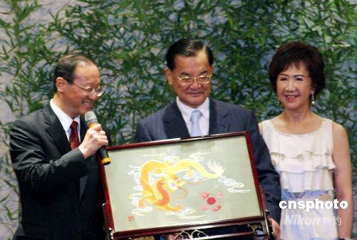 7月5日,中國國民黨榮譽主席連戰(zhàn)夫婦及部分國民黨高層在臺北會見到訪的海峽兩岸旅游交流協(xié)會會長邵琪偉一行。連戰(zhàn)表示,大陸居民赴臺旅游和兩岸周末包機的實現(xiàn),不僅為兩岸關系和平發(fā)展的偉大目標作出了貢獻,更為中華民族興盛發(fā)展寫下了新的一頁。會見之后,連戰(zhàn)和邵琪偉互贈禮物。禮物皆與“龍”有關。連戰(zhàn)贈給邵琪偉的禮物是由臺灣新竹工藝大師制作的琉璃“吉祥云龍”,“象征兩岸同屬中華民族,都是炎黃子孫,期待將來有更多的客運、貨運包機飛翔在兩岸的天空中”。邵琪偉贈送給連戰(zhàn)的是湘繡龍紋雙面繡。中新社發(fā) 黃少華 攝