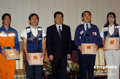 胡錦濤在札幌向日本國際救援隊醫(yī)療隊贈送禮品