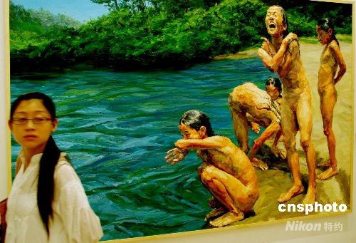 7月9日,以“色彩與奧林匹克”為主題的2008·第三屆中國北京國際美術(shù)雙年展吸引了眾多觀眾,來 自81個國家的747件當代繪畫和雕塑作品集中展出,其中很多作品都是世界各國藝術(shù)家專為北京奧運會創(chuàng)作的。中新社發(fā) 楊慧峰 攝