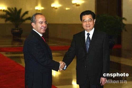7月11日,中國國家主席胡錦濤在北京人民大會堂與墨西哥總統(tǒng)卡爾德龍舉行會談。中新社發(fā) 盛佳鵬 攝
