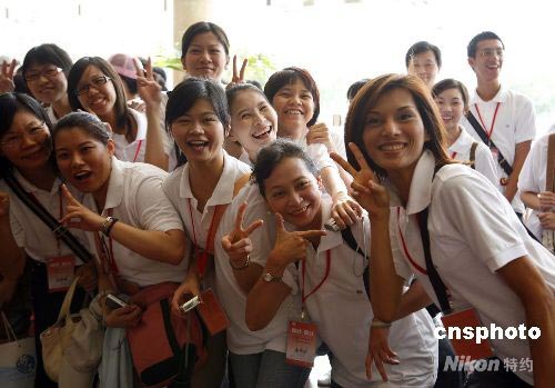 7月11日,臺灣學(xué)生在上海興高采烈地迎接夏令營開營。當(dāng)日,“龍脈相傳緣聚上!_胞青年夏令營”在上海開營,來自臺灣政治大學(xué)、成功大學(xué)、海洋大學(xué)、佛光人文學(xué)院的同學(xué),以及在滬的臺生、臺籍青年等百余人參加。中新社發(fā) 潘索菲 攝