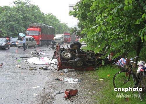 7月11日下午4時許,一輛四川牌大客車途經(jīng)廣西南寧市上林縣,與一輛搭客三輪摩托車正面碰撞,造成摩托車上4人死亡,其余4人重傷。圖為事故現(xiàn)場。中新社發(fā) 林泉 攝