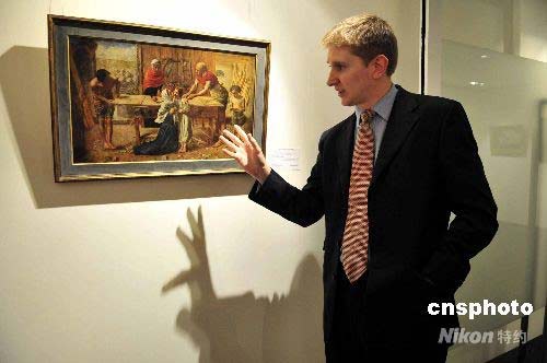 圖為《基督在家中》(作者:萊百克所羅曼及約翰米萊)估價(jià)約六百萬(wàn)至九百萬(wàn)港元。畫(huà)中主人翁為耶穌基督,他手掌因工受傷,血滴于腳背,圣母隨即上前安撫。中新社發(fā) 譚達(dá)明 攝