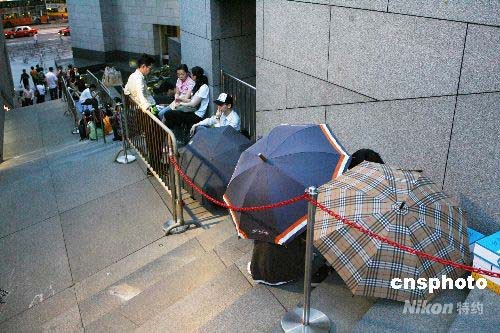 七月十四日,離中銀香港發(fā)行面額二十元港幣的奧運紀念鈔票還有兩天時間,香港中銀大廈外已有不少市民排隊等候,隊伍中不乏傘陣和帳篷。中新社發(fā) 武仲林 攝