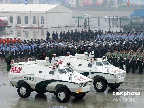 7月15日,2008北京奧運(yùn)會(huì)沈陽(yáng)火炬?zhèn)鬟f暨奧足賽安保決戰(zhàn)誓師大會(huì)冒雨在沈陽(yáng)奧體中心舉行,來自交警、消防、特警、武警、救護(hù)、檢疫、行政執(zhí)法的12個(gè)方隊(duì)進(jìn)行了誓師宣言,同時(shí)武警、特警、交警等警種展示了他們高科技的武器裝備。中新社發(fā) 趙敬東 攝