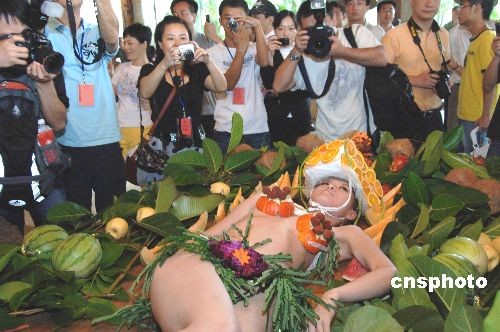 7月16日,廣東佛岡一度假森林舉行首屆“冰果狂歡節(jié)”,當(dāng)天景區(qū)方面特別炮制了一場(chǎng)“水果人體秀”,檸檬、紅蘿卜、櫻桃、西瓜……全都變成了模特身上的衣物, 整個(gè)活動(dòng)圍繞“清涼”主題,將清涼夏日演繹到了極致,令游客大為稱(chēng)奇。中新社發(fā) 梁永強(qiáng) 攝