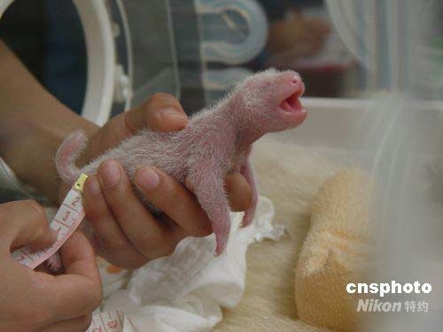 工作人員給熊貓幼仔量身長(zhǎng)
