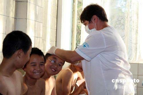 7月19日,184名來自中國四川地震災(zāi)區(qū)兒童抵達(dá)黑海岸邊的全俄“雛鷹”兒童中心,進(jìn)行三周康復(fù)療養(yǎng)。圖為兒童中心的醫(yī)生為這些初到的中國小客人檢查身體。中新社發(fā) 田冰 攝