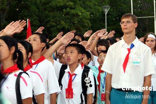 圖為升旗儀式上的中國地震災(zāi)區(qū)中小學(xué)生和他們的俄羅斯輔導(dǎo)員。中新社發(fā) 田冰 攝