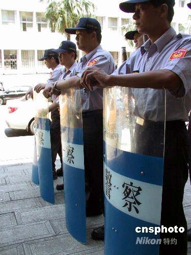 7月21日上午,臺(tái)北地方法院開(kāi)庭審理臺(tái)灣地區(qū)前領(lǐng)導(dǎo)人陳水扁等被控誹謗案,陳水扁首度以被告身份到庭應(yīng)訊。臺(tái)北市警方動(dòng)員多名警力會(huì)同法警維持場(chǎng)外秩序。中新社發(fā) 徐長(zhǎng)安 攝