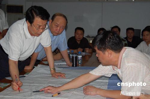 國家安監(jiān)總局局長王君(左一)連夜趕赴廣西百色,并于7月22日凌晨抵達(dá)百色煤礦透水事故現(xiàn)場(chǎng),部署營救工作。中新社發(fā) 劉萬強(qiáng) 攝