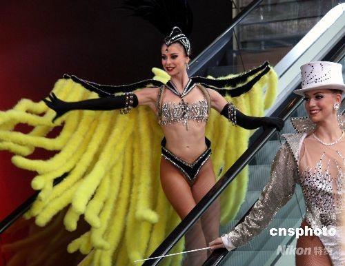 法國巴黎著名的麗都夜總會(huì)的舞娘在巴黎老佛爺百貨男裝館,為游人和顧客獻(xiàn)上風(fēng)情萬種的火辣演出。中新社發(fā) 王倩 攝