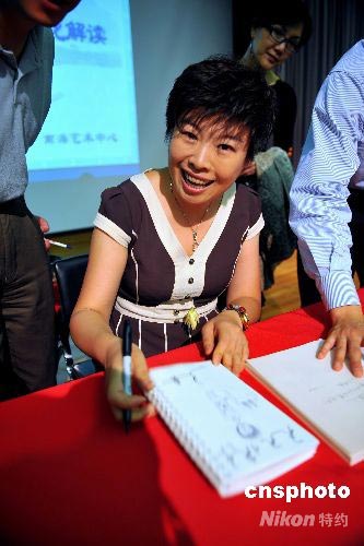 圖為于丹為舊金山灣區(qū)的華人華僑簽名留念。中新社發(fā) 陳鋼 攝