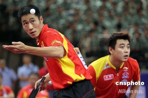 7月28日晚,中國乒乓球隊(duì)備戰(zhàn)奧運(yùn)熱身賽男團(tuán)決賽在無錫體育中心進(jìn)行。男隊(duì)設(shè)4支隊(duì)伍進(jìn)行淘汰賽,女隊(duì)分4隊(duì)進(jìn)行單循環(huán)比賽,并設(shè)男子單打擂臺賽。最終王皓、馬琳、王勵(lì)勤組成的男一隊(duì)苦戰(zhàn)5局奪得男子團(tuán)體冠軍。圖為王勵(lì)勤、王皓在雙打比賽中。中新社發(fā) 盛佳鵬 攝