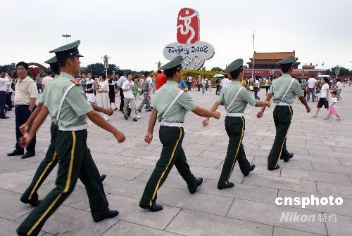 7月29日,一隊(duì)執(zhí)勤武警士兵從天安門廣場“中國印·舞動(dòng)的北京”主體花壇旁巡邏經(jīng)過。天安門廣場“奧運(yùn)”花壇整體工程進(jìn)入尾聲,奧運(yùn)氣氛更濃,市民與游客紛紛至此游玩拍照,安全保衛(wèi)工作也加強(qiáng),以確!捌桨矈W運(yùn)”。 中新社發(fā) 劉新 攝
