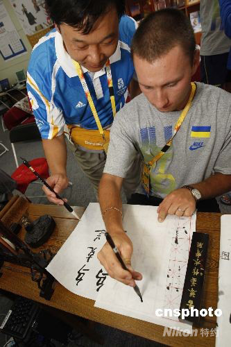 各國(guó)運(yùn)動(dòng)員和隨隊(duì)工作人員已陸續(xù)抵達(dá)奧運(yùn)村,他們?cè)趭W運(yùn)村住宅區(qū)和國(guó)際區(qū)商業(yè)文化街游玩購(gòu)物,感受濃郁的奧運(yùn)氣息和古老的中國(guó)文化。圖為7月29日,來(lái)自烏克蘭的射箭運(yùn)動(dòng)員亞歷山大,在北京奧運(yùn)村服務(wù)人員輔導(dǎo)下學(xué)寫(xiě)中文毛筆字。 中新社發(fā) 杜洋 攝
