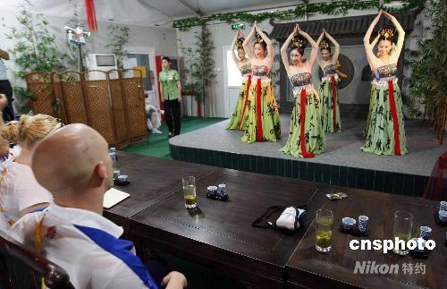 7月29日,在北京奧運(yùn)村的中國茶館里,剛剛訓(xùn)練完的英國跳水隊(duì)在這里品茶休息。奧運(yùn)村里完善的設(shè)施處處體現(xiàn)著濃濃的中國風(fēng)情。中新社發(fā) 杜洋 攝