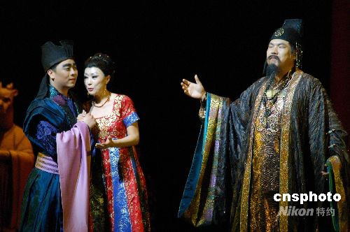 7月30日晚,由享譽(yù)國際的中國作曲家譚盾創(chuàng)作的歌劇《茶——心靈的明鏡》首度登上北京的國家大劇院。該劇通過追述中國茶文化的起源與陸羽的《茶經(jīng)》,引出唐朝公主與日本王子圣響的一段愛情,其音樂具有中國式的深遠(yuǎn)和淡定,同時運(yùn)用諸多自然聲響,融入水琴、云鑼、瓷器、陶鼓、紙、水等打擊樂器,與整部歌劇表現(xiàn)的茶經(jīng)、禪道在形式及內(nèi)容上渾然一體。圖為公主與日本王子的愛情受到皇帝恩準(zhǔn)。中新社發(fā) 潘旭臨 攝
