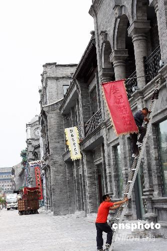 7月30日,北京前門大街幾名工作人員正在張掛牌匾布幌。中新社發(fā) 鄭雄增 攝