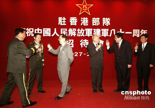 七月三十一日晚,為慶祝中國人民解放軍建軍八十一周年,并感謝特區(qū)政府和香港社會各界長期以來對駐軍的關(guān)心與支持,駐港部隊在中環(huán)軍營舉辦了“駐香港部隊?wèi)c祝中國人民解放八十一周年招待會”。全國政協(xié)副主席董建華、香港特區(qū)行政長官曾蔭權(quán)、中聯(lián)辦主任高祀任、外交部駐港特派員呂新華、駐港部隊司令員張少波少將、政治委員劉良凱中將等出席了此次招待會。中新社發(fā) 張勤 攝