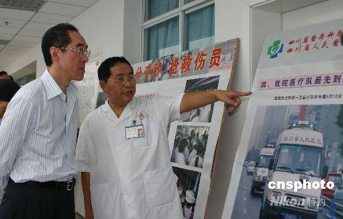 香港政務(wù)司司長唐英年率領(lǐng)特區(qū)政府代表團(tuán)20余人,來到成都四川省醫(yī)院慰問地震中受傷的民眾。圖為唐英年觀看圖板了解醫(yī)院救治地震傷員情況。中新社發(fā) 霍潺 攝
